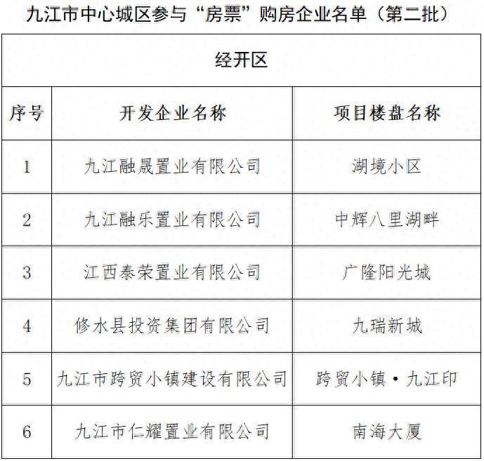 根据九江市政府《关于进一步促进九江市房地产良性循环和平稳健康发展的若干措施》(九府办发〔2024〕20号)的工作要求,通过房地产企业自主报名,并做出保交房承诺,经所在区住建部门审核后,现对市中心城区范围内各辖区自愿参与“房票”购房活动的第二批开发企业和项目予以公示。